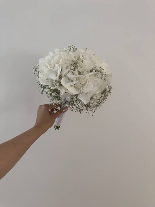 Brautstrauß mit einer Hotensie und Schleierkraut verleit einen edelen look.